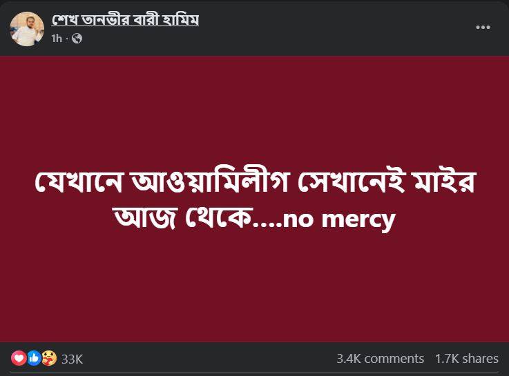 এবার ফেসবুকে সরাসরি হুঁশিয়ারি দিয়ে আওয়ামী লীগের প্রতি কোনো দয়া দেখানো হবে না বলে মন্তব্য করেছেন ঢাকা বিশ্ববিদ্যালয়ের কবি জসীমউদ্দীন হল ছাত্রদলের আহ্বায়ক শেখ তানভীর বারী হামিম।
