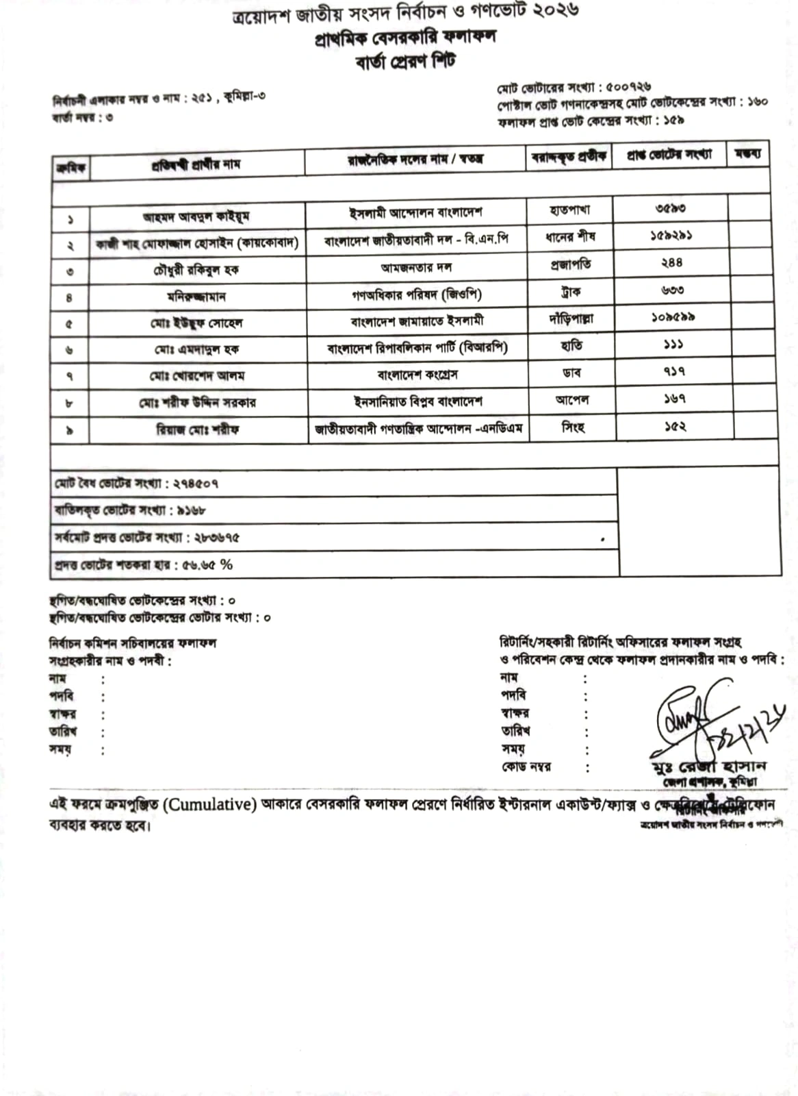 মুরাদনগরে দুই প্রার্থীর লড়াই, বাকিদের ভরাডুবি কুমিল্লা-৩ আসনে ৭ প্রার্থীর জামানত বাজেয়াপ্ত
