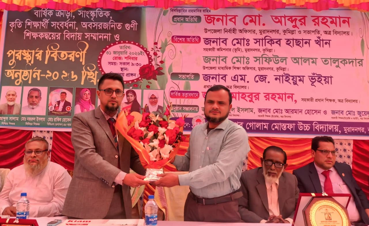 কুমিল্লার মুরাদনগর উপজেলার ঐতিহ্যবাহী কোরবানপুর গোলাম মোস্তফা (জি. এম.) উচ্চ বিদ্যালয় একদিনের জন্য পরিণত হয় শিক্ষা, সংস্কৃতি ও সাফল্যের এক বর্ণিল মিলনমেলায়। উৎসবমুখর পরিবেশে বিদ্যালয় প্রাঙ্গণে অনুষ্ঠিত হয়েছে বার্ষিক ক্রীড়া প্রতিযোগিতা, মনোজ্ঞ সাংস্কৃতিক অনুষ্ঠান, কৃতি শিক্ষার্থী সংবর্ধনা ও পুরস্কার বিতরণী। একইসঙ্গে দুইজন অবসরপ্রাপ্ত গুণী শিক্ষককে দেওয়া হয় বিদায় সম্মাননা।
