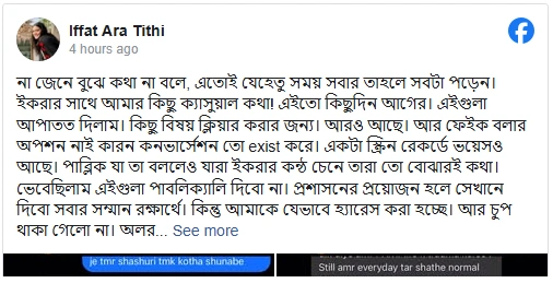 পোস্টে তিথি লেখেন, প্রয়োজনে প্রশাসন বা সংশ্লিষ্ট কর্তৃপক্ষের কাছেই তিনি এসব তথ্য দিতে চেয়েছিলেন। কিন্তু পরিস্থিতির কারণে জনসম্মুখে তা প্রকাশ করতে বাধ্য হয়েছেন। তিনি আরও জানান, এর আগেও তিনি কিছু জায়গায় অডিও বক্তব্য দিয়েছেন।