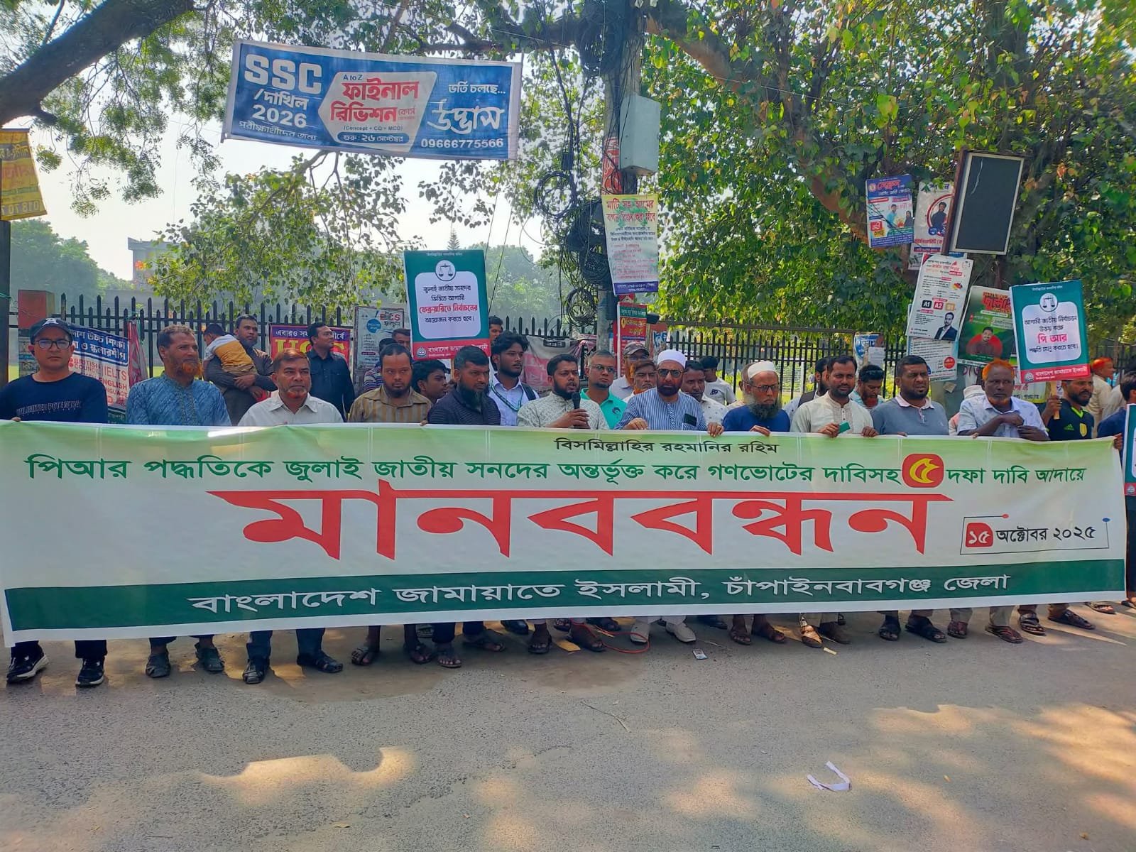 চাঁপাইনবাবগঞ্জে পিআর পদ্ধতিকে জুলাই জাতীয় সনদের অন্তর্ভুক্ত করা ও গণভোট আয়োজনসহ পাঁচ দফা দাবি বাস্তবায়নের দাবিতে মানববন্ধন অনুষ্ঠিত হয়েছে। বুধবার সকালে জেলা প্রশাসকের কার্যালয়ের সামনে বাংলাদেশ জামায়াতে ইসলামী চাঁপাইনবাবগঞ্জ জেলা শাখার উদ্যোগে এ কর্মসূচির আয়োজন করা হয়।