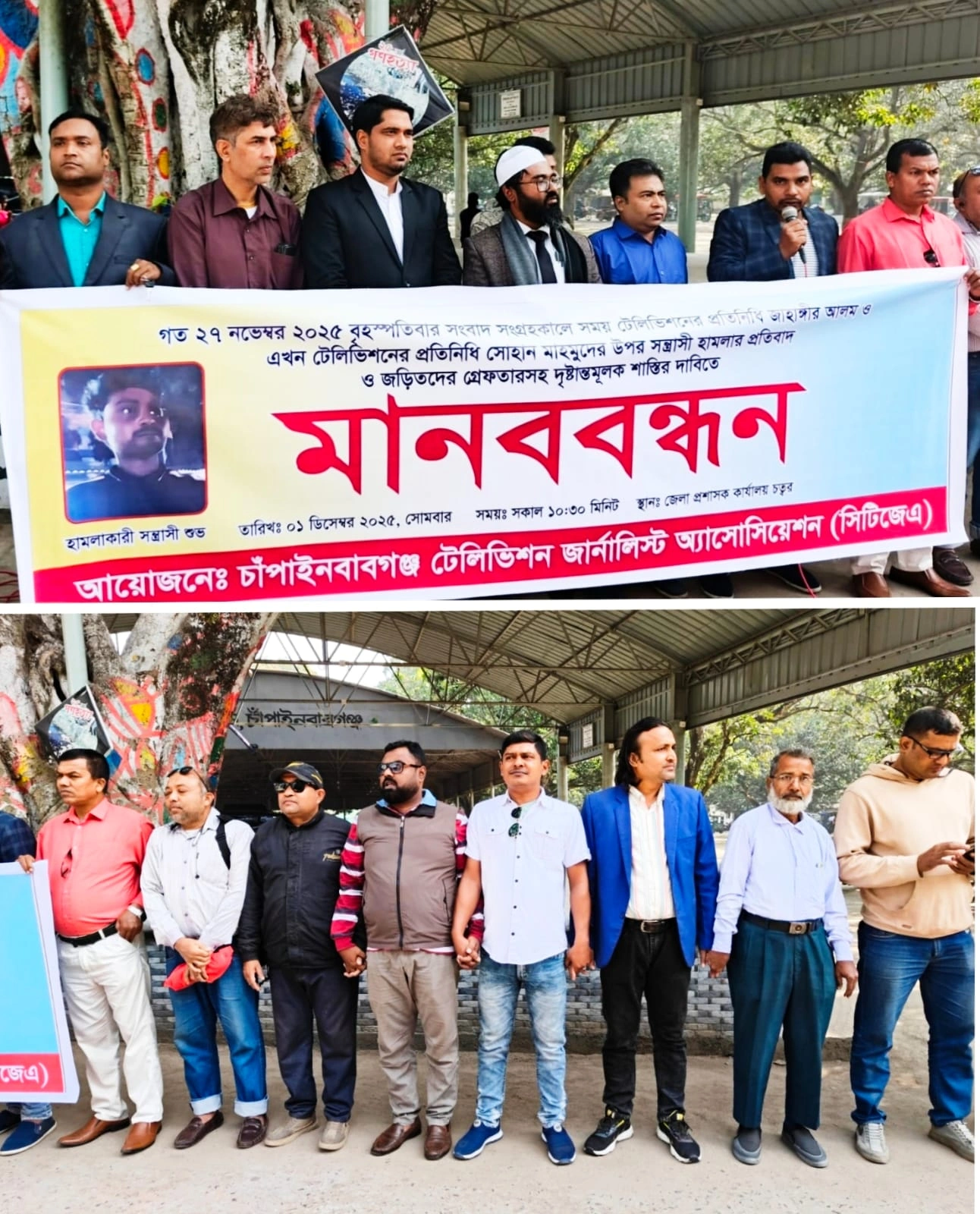 চাঁপাইনবাবগঞ্জে সংবাদ সংগ্রহকালে সাংবাদিক জাহাঙ্গীর আলম (সময় টেলিভিশন) ও সোহান মাহমুদ (এখন টেলিভিশন) এর উপর হামলার প্রতিবাদে মানববন্ধন অনুষ্ঠিত হয়েছে। হামলাকারীদের দৃষ্টান্তমূলক শাস্তির দাবিতে এই মানববন্ধনের আয়োজন করে চাঁপাইনবাবগঞ্জ টেলিভিশন।