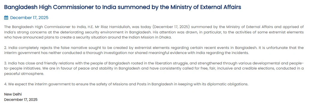 নয়াদিল্লিতে নিযুক্ত বাংলাদেশের হাইকমিশনার এম রিয়াজ হামিদুল্লাহকে তলব করার পর এর কারণ ব্যাখ্যা করে আনুষ্ঠানিক বিবৃতি দিয়েছে ভারতের পররাষ্ট্র মন্ত্রণালয়। বিবৃতিতে বাংলাদেশে সাম্প্রতিক নিরাপত্তা পরিস্থিতি নিয়ে গভীর উদ্বেগ প্রকাশ করেছে ভারত।