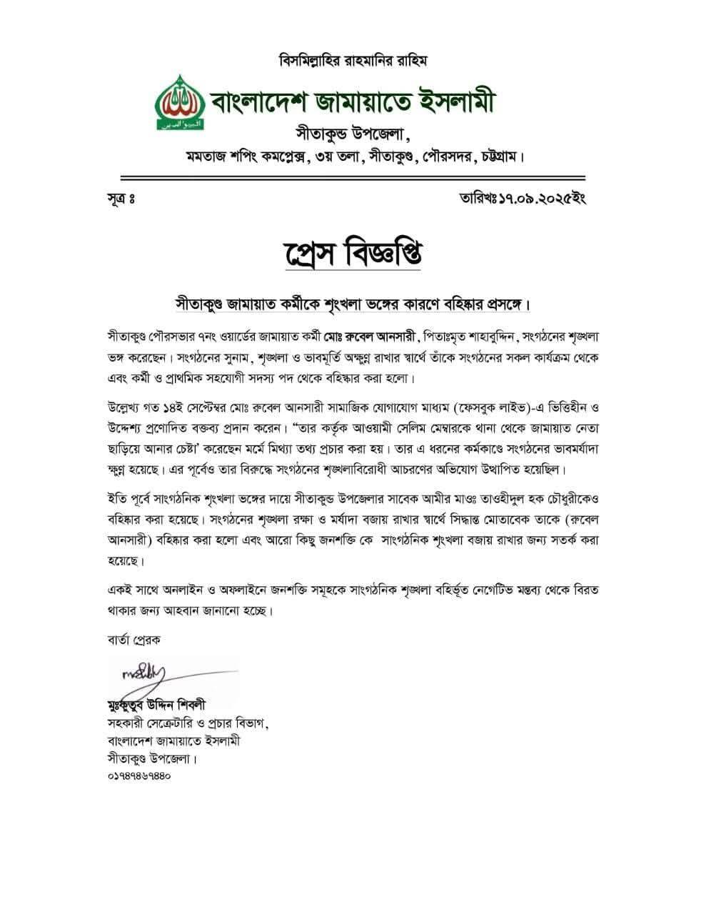 ঐদিন তিনি একজন রুকন হয়ে কেন থানায় গেলেন এবং যুব লীগ নেতাকে ছাড়িয়ে আনার জন্য ? পুলিশের উপর ছেড়ে দিতে পারতো। মেম্বার কে ছাড়ার সুপারিশ বিষয়টি আড়াল করে উল্টো রুবেলের উপর চাপিয়ে দিলেন দলের শৃঙ্খল ভঙ্গের অভিযোগ। বহিস্কার ঘোষিত রুবেল যিনি আওয়ামী লীগ সরকারের আমলে প্রায় ২৪ টি মামলার আসামী হয়ে ছিল,মাসকি মাস জেল খেটেছিল।বাংলাদেশ জামায়াতে ইসলামী সীতাকুণ্ড উপজেলার শাখার সহকারী সেক্রেটারী কুতুব উদ্দিন শিবলী স্বাক্ষরিত গত ১৭ সেপ্টম্বর প্রেস বিজ্ঞপ্তি সংগঠনের শৃংখলা ভঙ্গের অভিযোগে সংগঠনের এ কর্মীকে বহিষ্কার করা হয় বলে জানানো হয়।বহিষ্কারের সত্যতা নিশ্চিত করেন সীতাকুণ্ড উপজেলা জামায়াতের আমীর মাওলানা মিজানুর রহমান। তিনি বলেন, জেলা নেতৃবৃন্দের সাথে কথা বলে দলের শৃংখলা ভঙ্গের অভিযোগে তাকে বহিষ্কার করা হয়েছে বলে জানান। বিজ্ঞপ্তিতে বলা হয়, রুবেল আনসারী গত ১৪ সেপ্টেম্বর সামাজিক যোগাযোগ মাধ্যম ফেসবুক লাইভে ভিত্তিহীন ও উদ্দেশ্য প্রণোদিত বক্তব্য দেন। সেখানে তিনি দাবি করেন, স্থানীয় আওয়ামী লীগ নেতা সেলিম মেম্বারকে থানা থেকে জামায়াত নেতা ছাড়িয়ে আনার চেষ্টা করেছেন। যা সম্পূর্ণ মিথ্যা ও বানোয়াট। এ কারণে তাকে সংগঠনের সব কার্যক্রম থেকে এবং কর্মী ও প্রাথমিক সহযোগী সদস্য পদ থেকে বহিষ্কার করা হয়।উপজেলা জামায়াতের বিজ্ঞপ্তিতে আরও উল্লেখ করা হয়, তাছাড়া একই বিজ্ঞপ্তিতে ইতিপূর্বে একই ধরনের সাংগঠনিক শৃঙ্খলা ভঙ্গের দায়ে সীতাকুণ্ড উপজেলার সাবেক আমীর মাওলানা তাওহীদুল হক চৌধুরীকেও বহিষ্কার করা হয়। গত বুধবার (১৭/০৯/২৫ইং) কুতুব উদ্দিন শিবলী স্বাক্ষরিত প্রেস বিজ্ঞপ্তিতে জামাতের সাবেক আমির তাওহীদুল হক বহিষ্কার এই ধরনের কথা ফেসবুক সোশ্যাল মিডিয়ায় প্রকাশ করলে কুতুব উদ্দিন শিবলীর প্রতি পৌরসভাসহ পুরো উপজেলায় জামায়াতের নেতাকর্মীদের মাঝে চরম ক্ষোভ এবং সমালোচনা শুরু হয়।এদিকে,বহিষ্কার আদেশে রুবেল আনছারী সামাজিক যোগাযোগ মাধ্যম ফেসবুকে লিখেছেন,তার প্রতি বহিষ্কারাদেশ অন্যায়,অবিচার ও ভিত্তিহীন এবং অন্যায়কে আড়াল করার সামিল।কারণ ‘আলহামদুলিল্লাহ এটা মিথ্যা অপপ্রচার নয়, চির সত্য। সেলিম মেম্বারকে ছাড়াতে প্রফেসর জাহাঙ্গীর ভাই থানায় গিয়ে ছিল। আর একথা সাংবাদিকদের কাছে জাহাঙ্গীর ভাই বলেছে যে, উনি সেলিম মেম্বার আওয়ামী লীগ বা যুবলীগ করে আমি জানিনা,তানি আমার আত্মীয় তাই দেখতে গিয়েছিলাম।