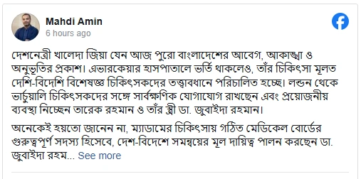 মাহাদী আমীন আরও জানান, মেডিকেল বোর্ডে গুরুত্বপূর্ণ সদস্য হিসেবে দায়িত্ব পালন করছেন ডা. জুবাইদা রহমান। দেশ-বিদেশের চিকিৎসকদের সঙ্গে সমন্বয় করে প্রয়োজনীয় সিদ্ধান্ত নিচ্ছেন তিনি। পাশাপাশি তারেক রহমান নিজে প্রতিটি পদক্ষেপ ঘনিষ্ঠভাবে পর্যবেক্ষণ করছেন, যাতে চিকিৎসার ক্ষেত্রে কোনো বিলম্ব বা সীমাবদ্ধতা না থাকে।