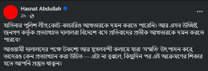 মঙ্গলবার (২৩ সেপ্টেম্বর) সকালে ফেসবুকে দেওয়া এক স্ট্যাটাসে তিনি লিখেন, “হাসিনার পুলিশ লীগ কিংবা কোর্ট-কাচারিও আখতারকে দমন করতে পারেনি। তাহলে জনগণের দ্বারা প্রত্যাখ্যাত, দালালচক্র বিদেশে বসে তাকে দমন করবে— এটা ভাবাই যায় না।”