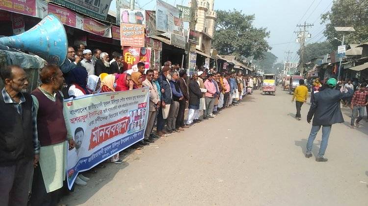 কুড়িগ্রামের উলিপুরে পৌর যুবদলের যুগ্ম আহ্বায়ক আশরাফুল ইসলামের হত্যাকারীদের গ্রেপ্তার ও বিচারের দাবিতে মানববন্ধন অনুষ্ঠিত হয়েছে। আজ সোমবার (৩০ ডিসেম্বর) দুপুরে উপজেলা ও পৌর যুবদলের আয়োজনে চৌরাস্তা মোড়ে এ মানববন্ধন হয়।