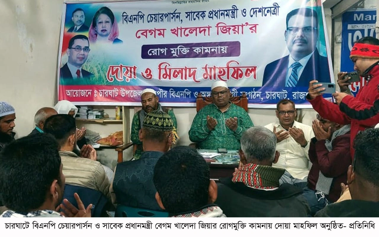 বিএনপি চেয়ারপার্সন ও তিনবারের সাবেক প্রধানমন্ত্রী বেগম খালেদা জিয়ার দ্রুত রোগমুক্তি ও সুস্থতা কামনায় রাজশাহীর চারঘাটে দোয়া ও মিলাদ মাহফিল আয়োজন করা হয়েছে। শনিবার সন্ধ্যায় উপজেলা ও পৌর বিএনপির উদ্যোগে উপজেলা বিএনপির কার্যালয়ে এ আয়োজন অনুষ্ঠিত হয়।