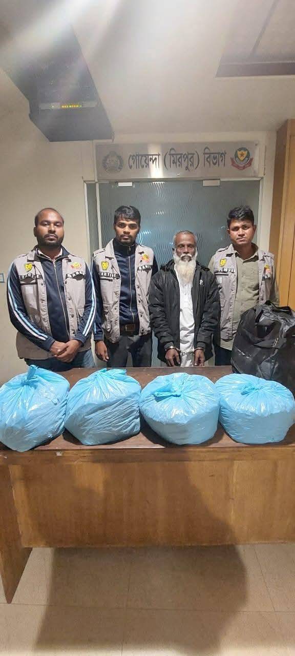 ডিবি-মিরপুর বিভাগ সূত্রে আরো জানা যায়, রবিবার রাতে গোপন সংবাদের ভিত্তিতে তথ্য পাওয়া যায়, একজন মাদক ব্যবসায়ী যাত্রীবেশে ফেনী থেকে ঠাকুরগাঁওগামী একটি বাসে গাঁজাসহ আসছে। এমন তথ্যের ভিত্তিতে যাত্রাবাড়ীর রায়ের বাজার এলাকার মেসার্স আকাশ ডোর অ্যান্ড ফার্নিচার কারখানার পাশে পাকা রাস্তার উপর চেকপোষ্ট ডিউটি পরিচালানা করে মিরপুর গোয়েন্দা বিভাগের পল্লবী জোনাল টিম। চেকপোস্ট পরিচালনাকালে শান্তি পরিবহন নামে একটি বাস তল্লাশী করে মো: আলফু মিয়াকে গ্রেফতার করা হয়। এসময় তার নিকট থাকা একটি কালো রংয়ের ট্রাভেল ব্যাগ হতে আট কেজি গাঁজা ও মাদক ব্যবসায় ব্যবহ্নত একটি মোবাইল ফোন উদ্ধার করা হয়। উদ্ধারকৃত গাঁজার আনুমানিক মূল্য ১ লক্ষ ৬০ হাজার টাকা।