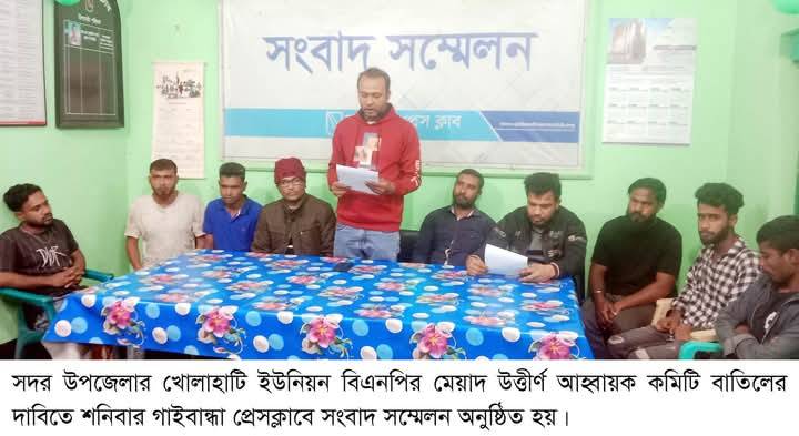 গাইবান্ধা সদর উপজেলার খোলাহাটি ইউনিয়ন বিএনপির মেয়াদ উত্তীর্ণ আহ্বায়ক কমিটি বাতিল করে দলের গঠনতন্ত্র অনুযায়ী কাউন্সিলের মাধ্যমে প্রত্যক্ষ ভোটে নেতা নির্বাচনের দাবি জানানো হয়েছে। গাইবান্ধা প্রেসক্লাবে শনিবার এক সংবাদ সম্মেলনে এই দাবি জানানো হয়।
